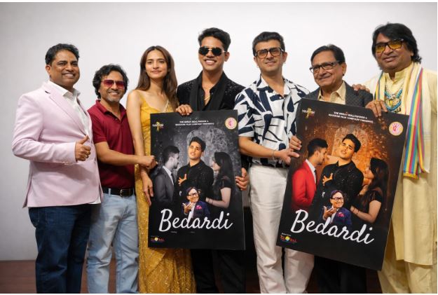 Lyricist Mukesh Kumar Masoom with Padma Shri Sonu Nigam, music composer Dilip Sen, legendary singer Agam Kumar Nigam, Hero Sangeet Masoom, Asia Masoom and Kailash Masoom during the release of the music album ‘Bedardi’.”