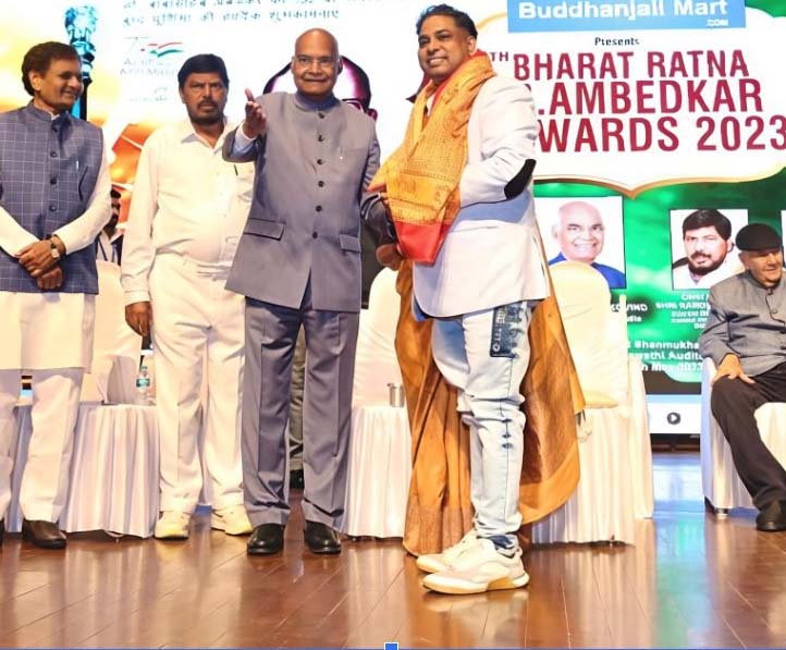 “Former President of India Ram Nath Kovind felicitating Mukesh Kumar Masoom. Also seen are Union Minister of State for Social Justice and Empowerment Ramdas Athawale and MLC Dr. Lalji Prasad Nirmal.”