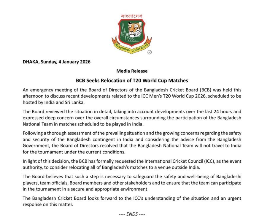 एक दिन पहले रविवार, 4 जनवरी को बांग्लादेश क्रिकेट बोर्ड ने टी-20 वर्ल्ड कप खेलने के लिए अपनी टीम भेजने से इंकार कर दिया था। इतना ही नहीं, BCB ने ICC से अपने मैच श्रीलंका में कराने का अनुरोध किया था। BCB ने इस मीडिया रिलीज में जानकारी दी।