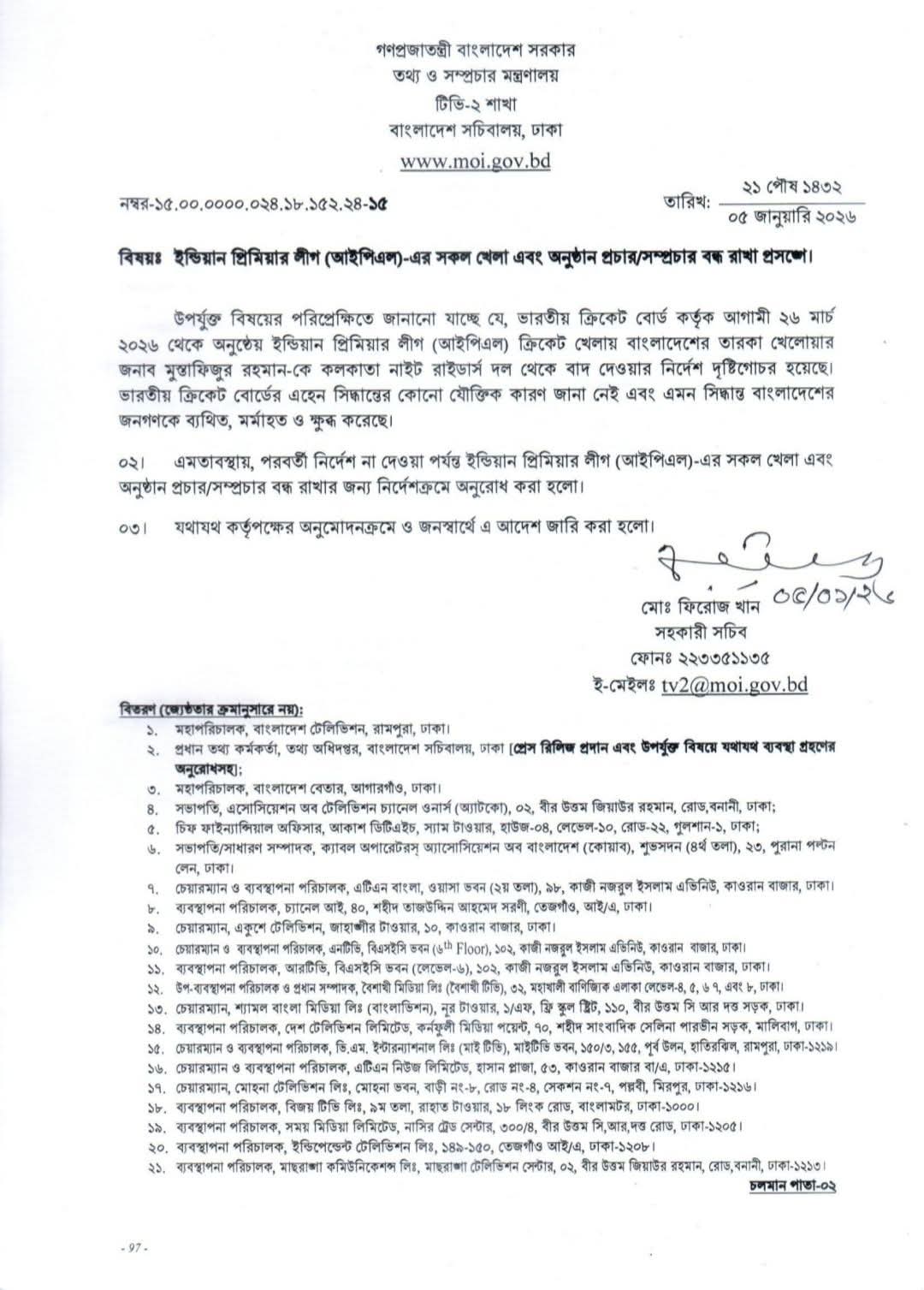 बांग्लादेश के सूचना एवं प्रसारण मंत्रालय के निर्देश…