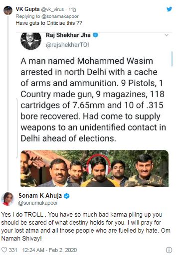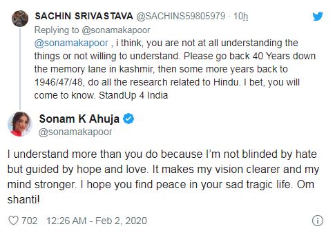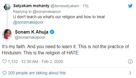 इसके बाद लोगों ने सोनम कपूर को कुछ खास लोगों ने ट्रोल करना शुरू कर दिया। इसके बाद सोनम कपूर भी पीछे नहीं रही और उन्होंने यूजर्स को एक-एक करके जवाब दिया। एक यूजर ने लिखा कि आप हमें धर्म के बारे में ना सिखाएं तो सोनम कपूर ने कहा, ‘यह मेरा विश्वास है और आपको इसको समझने की जरुरत है। यह हिंदुत्व नहीं है और यह नफरत का धर्म है।’