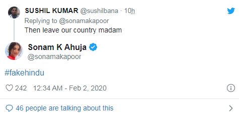 एक यूजर ने जब उन्हें देश से बाहर जाने को कहा तो एक्ट्रेस ने उन्हें फेक हिंदू कह दिया।