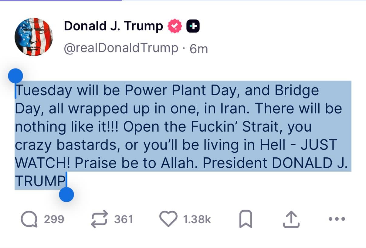 डोनाल्ड ट्रंप ने अपने पोस्ट में बेहद आक्रामक भाषा का इस्तेमाल करते हुए लिखा, “मंगलवार का दिन ईरान में ‘पावर प्लांट डे’ और ‘ब्रिज डे’ होगा। ये दोनों एक ही दिन में होंगे। ऐसा पहले कभी नहीं हुआ होगा!!!” विशेषज्ञों का मानना है कि ट्रंप का यह इशारा ईरान के बिजली घरों और प्रमुख पुलों को निशाना बनाने की ओर है। उन्होंने आगे लिखा, “उस होर्मुज स्ट्रेट को खोल दो, वरना तुम नरक में रहोगे। बस देखते जाओ! अल्लाह की जय हो।” ट्रंप का यह अंदाज बता रहा है कि वे अब कूटनीति के बजाय सीधी सैन्य कार्रवाई के मूड में हैं।