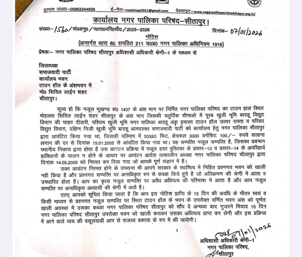 सीतापुर। नगर पालिका परिषद सीतापुर ने एक बड़ा प्रशासनिक कदम उठाते हुए टाउन हॉल परिसर, सिविल लाइंस स्थित नज़ूल खंड सं० 1437 के अंश भाग पर किए गए कई अवैध कब्ज़ों और कर पंजीका में दर्ज “मांग/इंद्राज” को निरस्त करने की कार्रवाई शुरू कर दी है। 7 जनवरी 2026 को जारी इन नोटिसों से नगर पालिका ने स्पष्ट कर दिया है कि वह अपनी कीमती संपत्ति पर किसी भी प्रकार का अवैध अध्यासन बर्दाश्त नहीं करेगी।