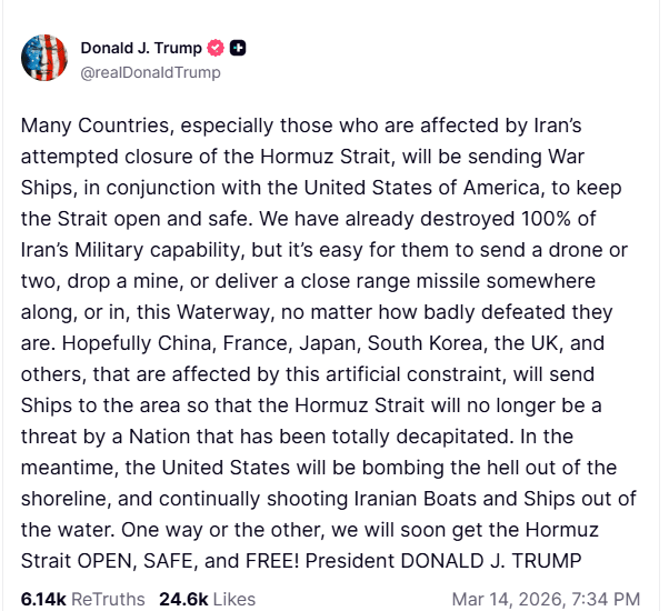 ईरान की इस घेराबंदी के जवाब में अमेरिकी राष्ट्रपति डोनाल्ड ट्रंप ने अंतरराष्ट्रीय समुदाय से एकजुट होने की अपील की है। ट्रंप ने चीन, फ्रांस, जापान, दक्षिण कोरिया और ब्रिटेन जैसी प्रमुख शक्तियों से अपने युद्धपोत होर्मुज में तैनात करने को कहा है। ट्रंप का तर्क है कि चूंकि इन देशों का व्यापार इस रुकावट से सीधे प्रभावित हो रहा है, इसलिए उन्हें अमेरिका के साथ मिलकर इस जलमार्ग को ‘सुरक्षित और आजाद’ रखने की जिम्मेदारी उठानी चाहिए। ट्रंप ने दावा किया कि अमेरिका ईरान की सैन्य क्षमता को पहले ही काफी हद तक तबाह कर चुका है, लेकिन ईरान अभी भी माइन बिछाने या ड्रोन हमलों जैसी ‘बनावटी रुकावटें’ पैदा करने की कोशिश कर रहा है।