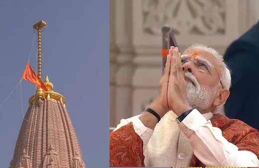 अयोध्या में ऐतिहासिक क्षण आ गया है. श्रीराम जन्मभूमि मंदिर के शिखर पर धर्म ध्वजा फहरा दी गई है. प्रधानमंत्री नरेंद्र मोदी ने इस पवित्र पल में हाथ जोड़कर भगवान श्रीराम को नमन किया. वैदिक मंत्रोच्चार के बीच यह ध्वजारोहण अभिजीत मुहूर्त में संपन्न हुआ, जिससे रामनगरी उत्सवमय माहौल में डूब गई.