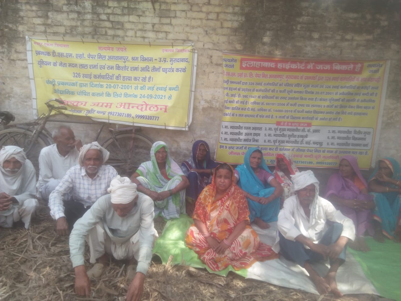 जीनस पेपर मिल के गेट पर पिछले 8 माह से धरने पर बैठे कर्मचारी